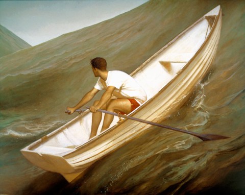 noe annet. Det er det normale. Lette etter gutt i båt, gutt som ror i båt alene, vann, havet, ocean, gutt med hund. Fant Bo Bartlett. Føler ubehag. Føler meg umoderne når slikt interesserer, figurer, overflate, det banale, men det får bare være. Jeg har ikke mye bruk for streker og fargesprak eller bare flater. I filmen som jeg leter etter bilder til er det hus og trær og hav og veier som forsvinner inn og over horisonten. I filmen er det folk som prater med hverandre med setninger som henger sammen, de gir og får beskjeder, de slår og dreper, de elsker av og til. Oftest bare helt til sist og kanskje litt for seint. På film er alt temmelig umoderne fremdeles. Ligner. På oss selv. Utolket.