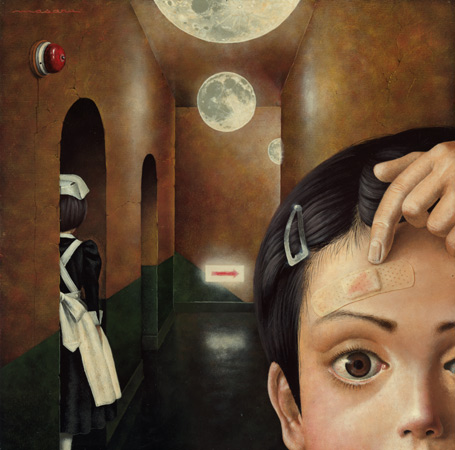 One thinks there is a reason to walk briskly to the far corner of the field, but the other thinks there is no reason, and stands where she is. At first she stands still where she is, while the other walks away briskly, but then changes her mind, and follows.She follows, but stops halfway there. Is it that she has forgotten why she was going there, or that she has lost interest? She and the other are standing in parallel positions. She is looking straight ahead.