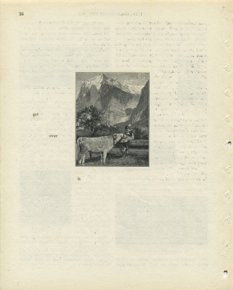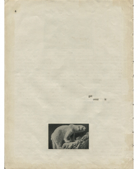 Pages from old schoolbooks that are altered by sanding and scraping away everything except the page number, an illustration, and a few chosen words. Matthew Cusick.