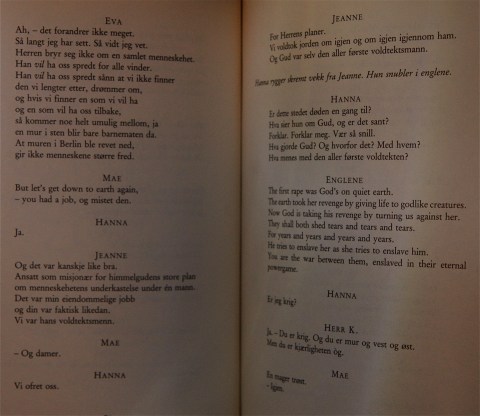 EVA: I alle kvinner lengter en Gudinne, og alle menn har Gud i seg langt inne. HERR K: I våre kjærlighetsliv har han og hun tatt pant, og vi elendige, vi skulle vist dem at det er sant, at det går an å gjøre dette annerledes. Vi skulle samlet sødme som bier samler honning, og lært vår Gud i himmelen å vekke opp sin dronning. HANNA: Men vil det si at allting kommer an på oss? HERR K: Det gjorde det. Vi var på jorden for å sloss. For kjærlighet. JEANNE: Og fred. MAE WEST: Av fred min kjære Jeanne, kommer det ingen himmel.
