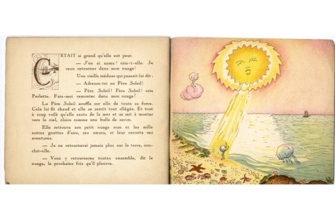 Det handler om Lille Perle, en dråpe fra en sky, antagelig fra en av de vi kaller perlemorskyer. Hun ville så gjerne ned på jorda, hun syntes det så veldig fint ut, så mange ting, slott og sjøer og byer og sauer og kuer. Lille Perle maste og maste og fikk lov til slutt. Hun falt. Hun gikk rundt på jorda en stund, men nesten ingenting var sånn som det hadde sett ut fra oven. En nokså vanlig erfaring. Men det er ikke sånn at det hjelper å si det til folk eller dråper. Du må ned der å kjenne det selv, på kroppen. Det gikk som det måtte, Lille Perle ville tilbake til himmelen sin og skyen og begynte å gråte. Da kom et et eller annet forbi, jeg vet ikke hva, så god i fransk er jeg heller ikke, men i hvert fall, det som kom forbi sa: Rop på solen. Og Lille Perle ropte på solen. Sol, jeg vil tilbake til skyen min! Og solen sa, okei da. Den skinte på Lille Perle av all sin kraft. Og Lille Perle ble varm og steg og steg og steg som en såpeboble til vers. Det gikk så lett at hun nesten trodde hun gjorde det selv. Og hun jublet. Snart var hun tilbake i perlemorskyen sin sammen med de millioner av andre dråper med vann hun hadde forlatt. Hun var veldig lettet og glad. Hun fortalte de andre om alt og avsluttet med: Jeg drar aldri tilbake til jorden igjen. Å, joda, sa perlemorskyen litt strengt, jeg beklager, men alle dere dråper skal ned der igjen, dere skal ned neste gang jeg gråter.
